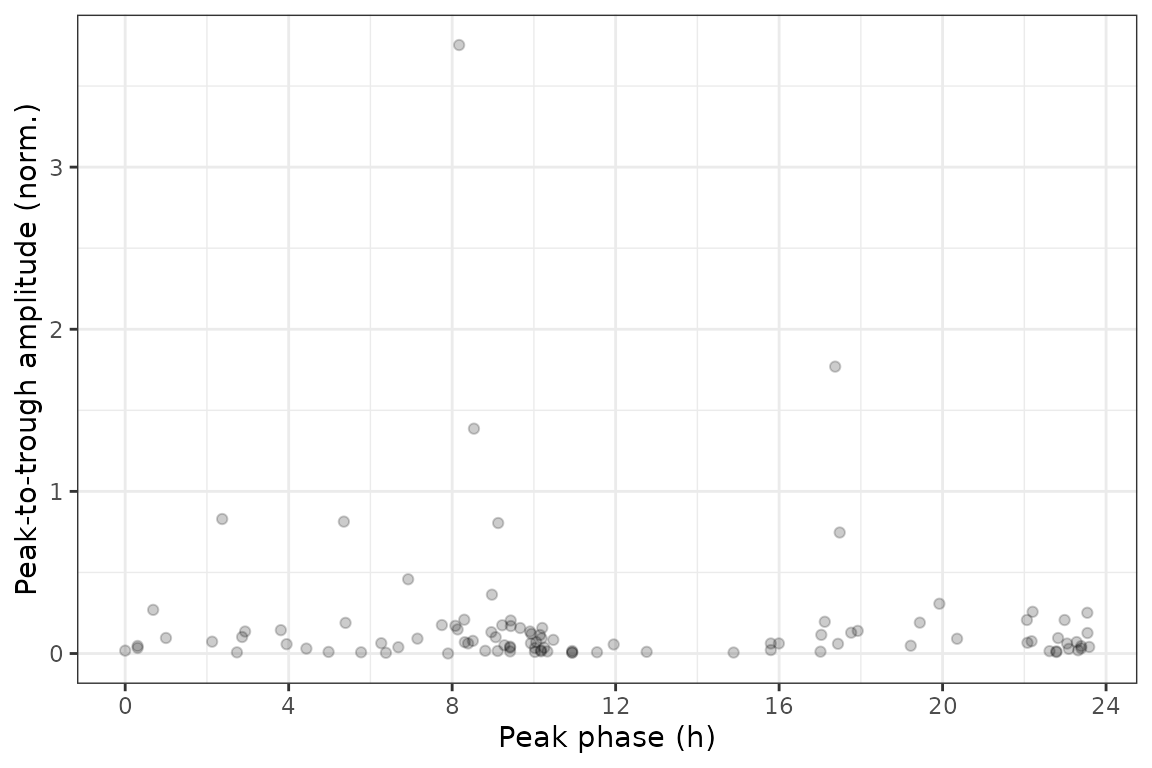rhyStats = getRhythmStats(fit)We can examine the distributions of the statistics in various ways, such as ranking genes by peak-to-trough amplitude (no p-values necessary) or plotting peak-to-trough amplitude vs. peak phase.